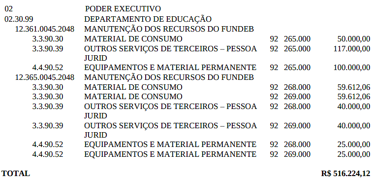 O recurso necessário ao atendimento da dotação acima será coberto com recursos provenientes do saldo do FUNDEB.